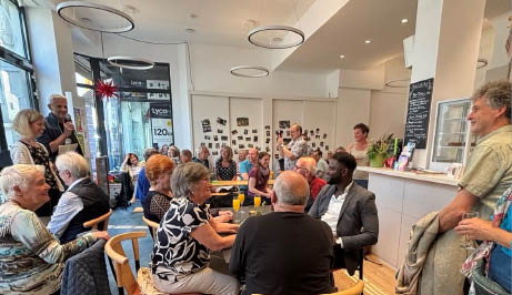 Die Mitarbeitenden überraschten den Jubilar und seine Frau mit gemeinsamen Erinnerungen und Fotos, Liedern und Gedichten. Dabei stand der Leitvers aus Jeremia 29,7 im Mittelpunkt: Der Stadt Bestes zu suchen und für sie zu beten.
